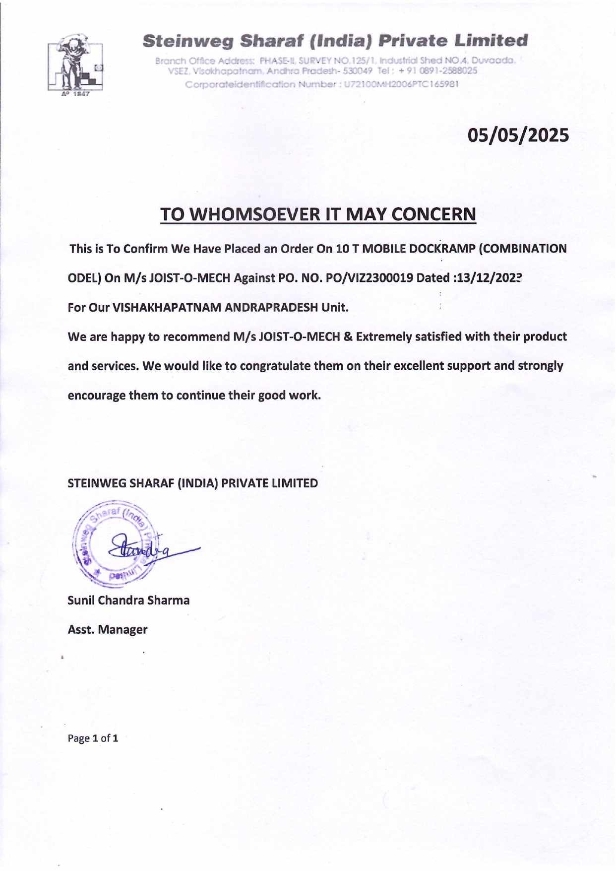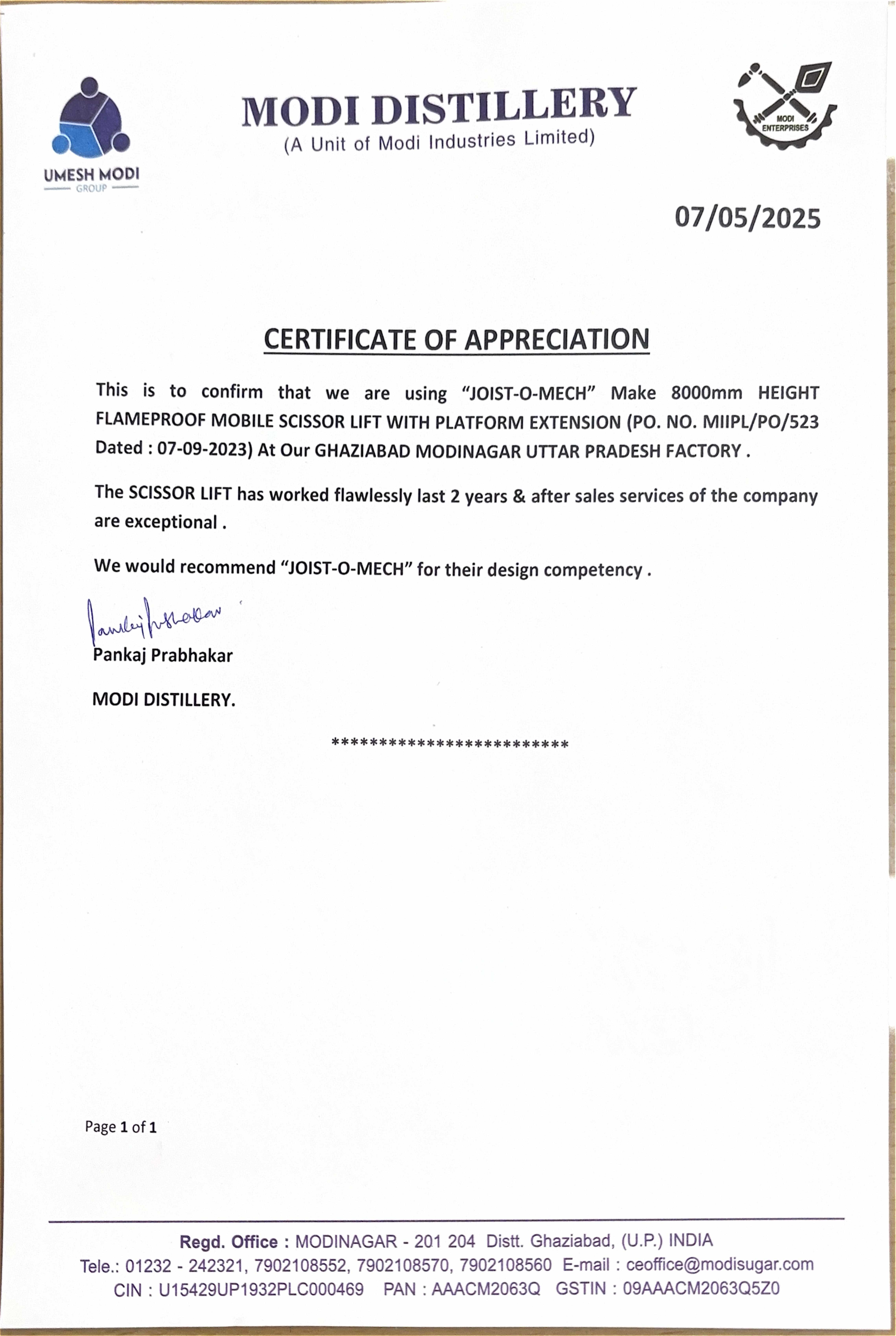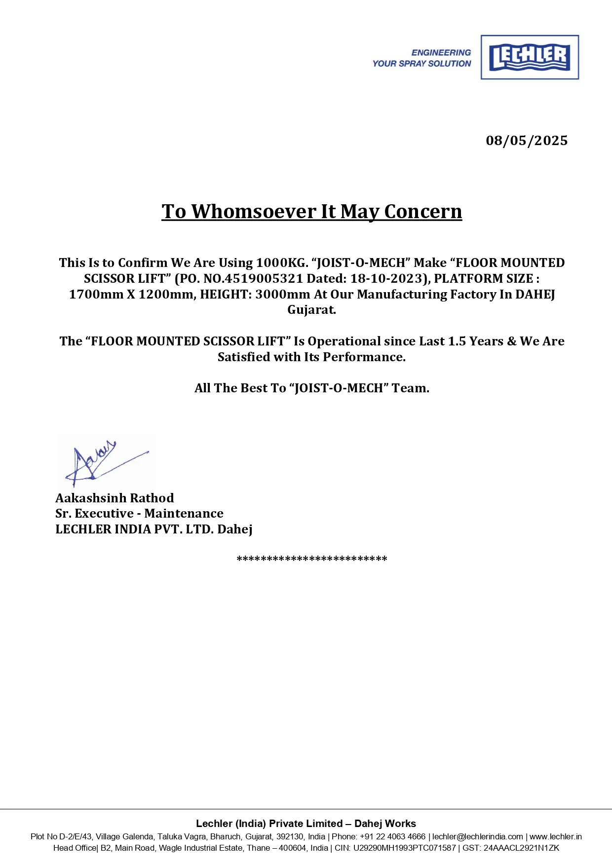 The commitment of JOIST-O-MECH gets commemorated by your words of encouragement and appreciation. We take privilege to express our gratitude towards all our clients whose Letters of Appreciation are an honour to us like none other.