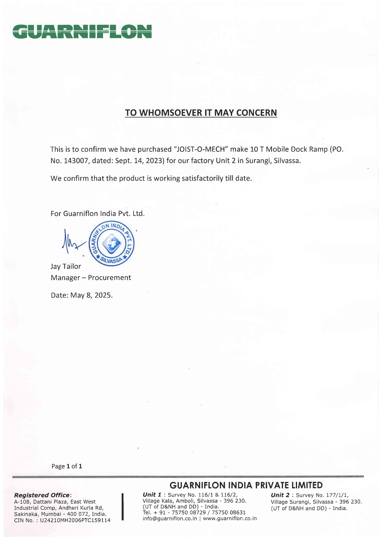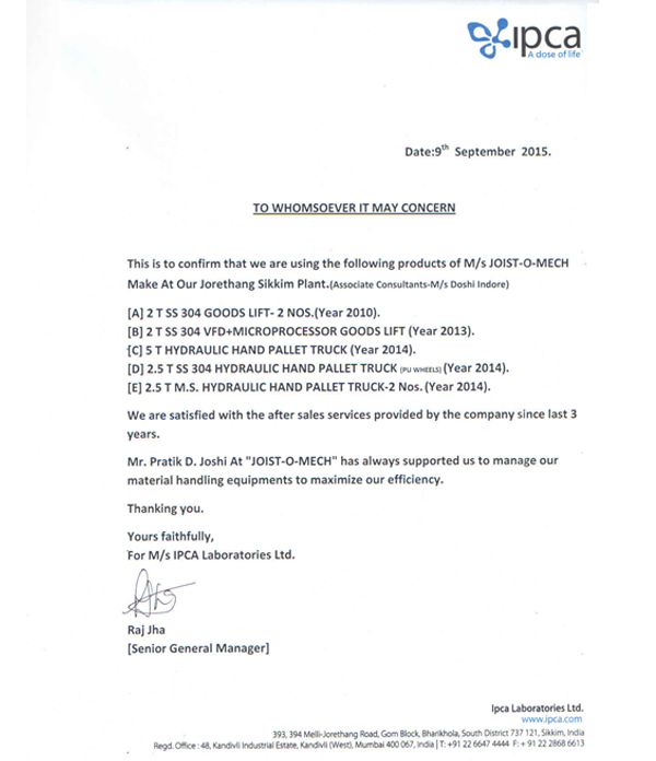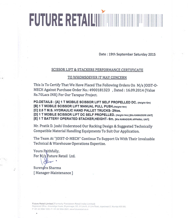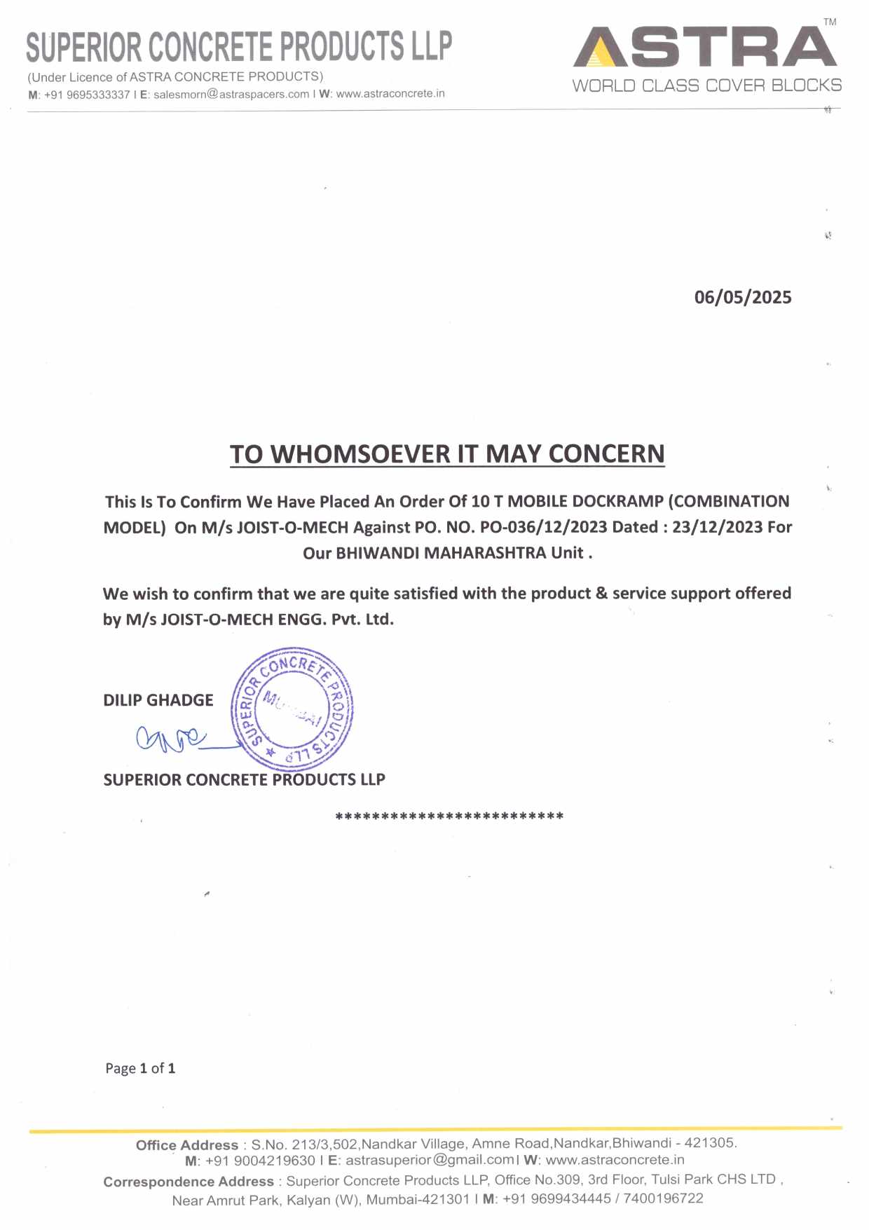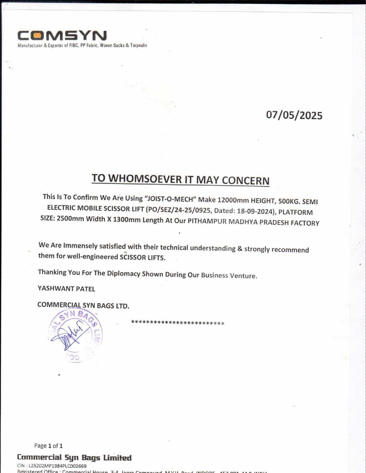 The commitment of JOIST-O-MECH gets commemorated by your words of encouragement and appreciation. We take privilege to express our gratitude towards all our clients whose Letters of Appreciation are an honour to us like none other.
